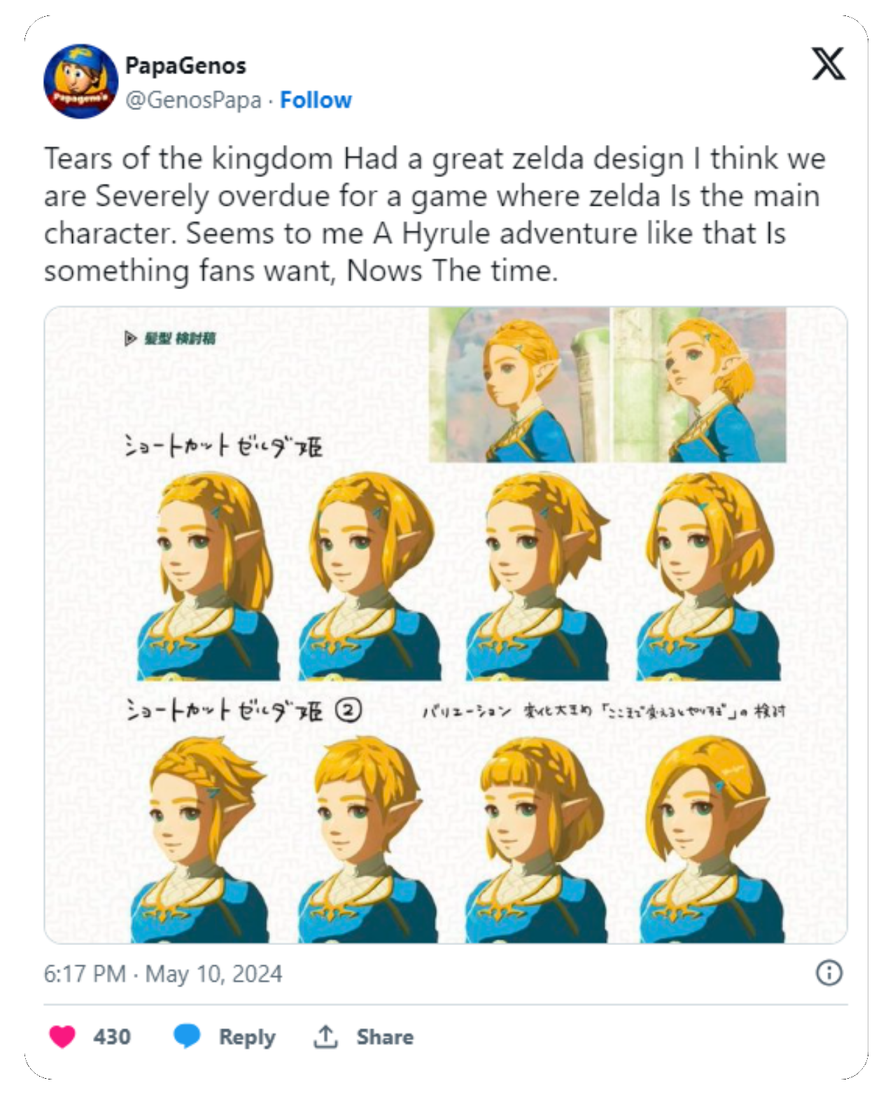 In een post op X prees hij het ontwerp van Zelda uit Tears of the Kingdom en dat deed hij door een nogal cryptische benadering toe te passen. Als je goed oplet, zie je namelijk dat alle hoofdletters uit de tweet een zin vormen: 'This is a hint', waarop hij doelt op Zelda als speelbaar personage.